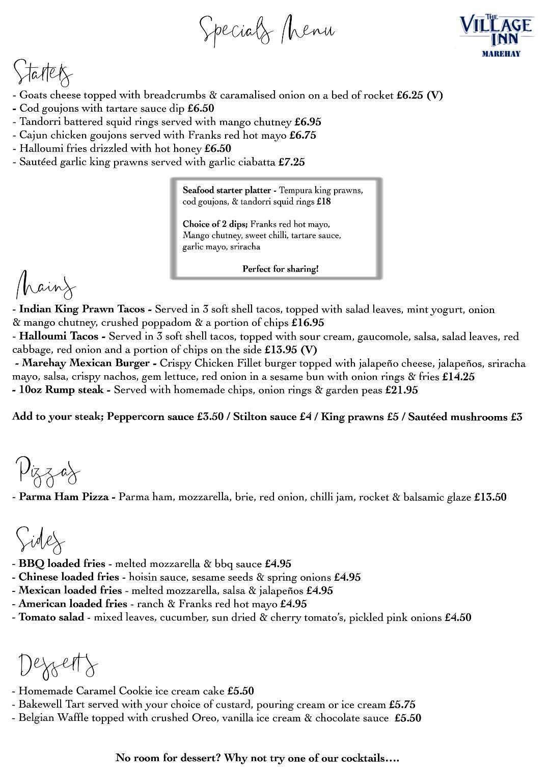 The Village Inn offers a new range of menus including Evening Menu, a Specials menu, Gluten free menu, Vegetarian and Vegan Menu , together with Wood Fired Pizzas and an excellent Sunday Carvery. Table bookings should be booked in advance so please call us on 01773 743970. We open from Wednesday to Sunday We also offer award winning beers & ciders, craft beers and ales to compliment our menus. Free access WIFI |